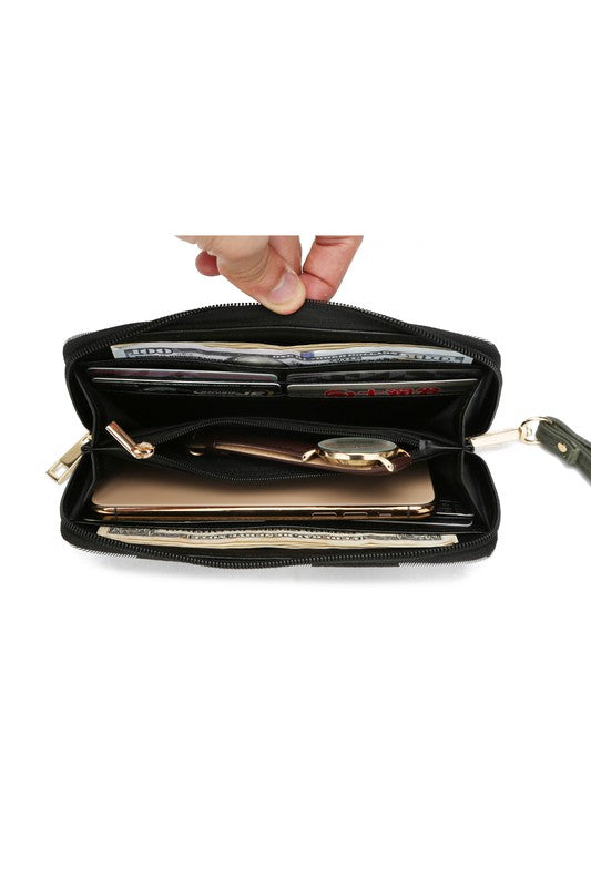Features 8 cards slots, a centered zipper pocket perfect for coin or receipts and 2 full bill compartments